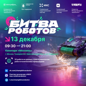 Внимание,финальный этап Международного чемпионата по битве роботов сезона 2025 года Минцифры России объявляет о проведении финального этапа Международного чемпионата по битве роботов сезона 2025 года! 13 декабря в Москве, на территории кинопарка ...