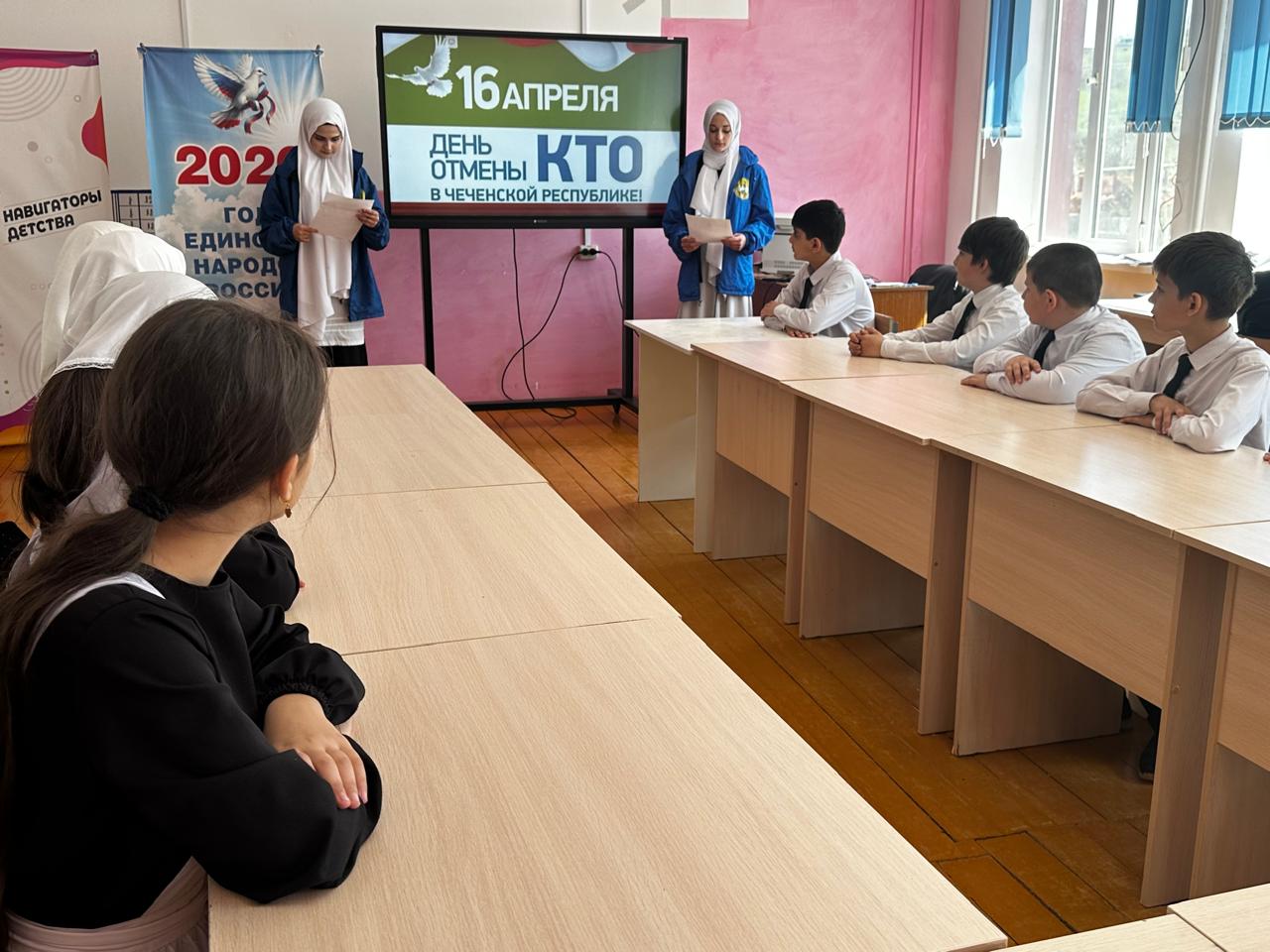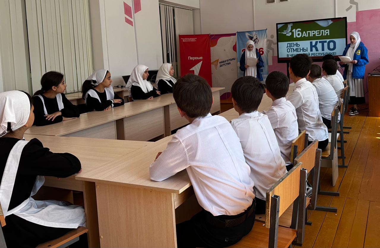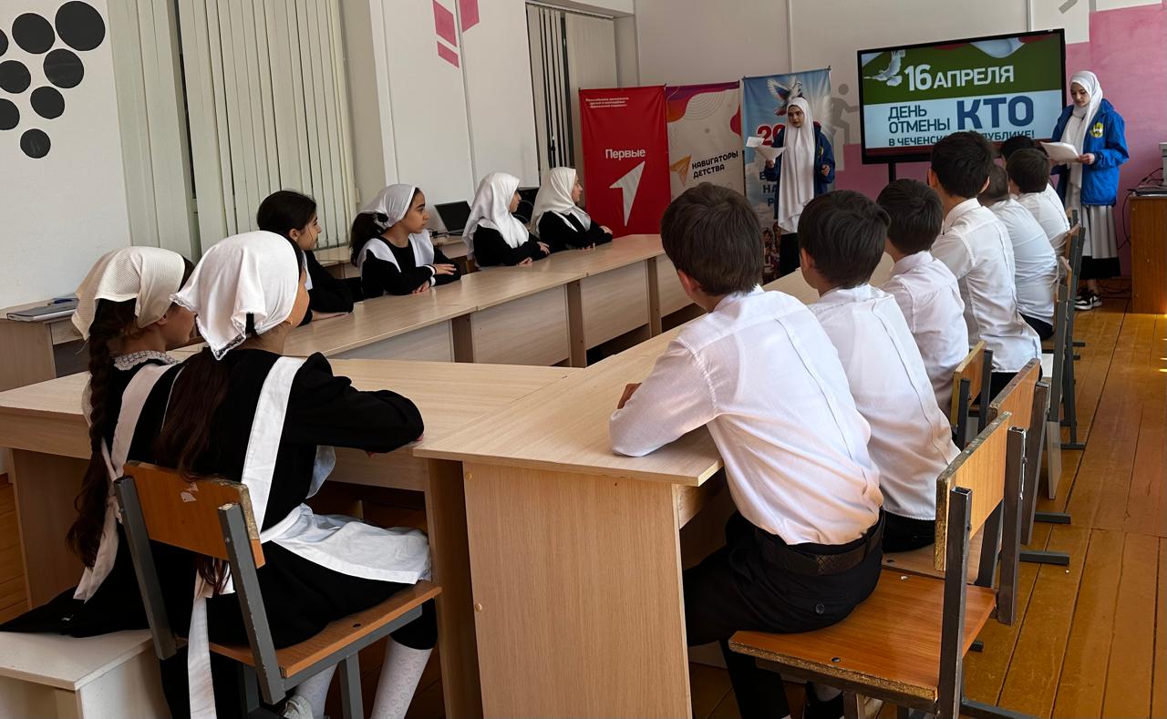 15.04.2025 в соответствии с планом мероприятий ЧРОО ЕДЮО « Юные Кадыровцы» МБОУ «СОШ им. В.Г.Гайтемирова с. Замай- Юрт» провели классный час в 5 классе, посвящённый памятной дате — Отмена контртеррористической операции в Чечне « День мира»